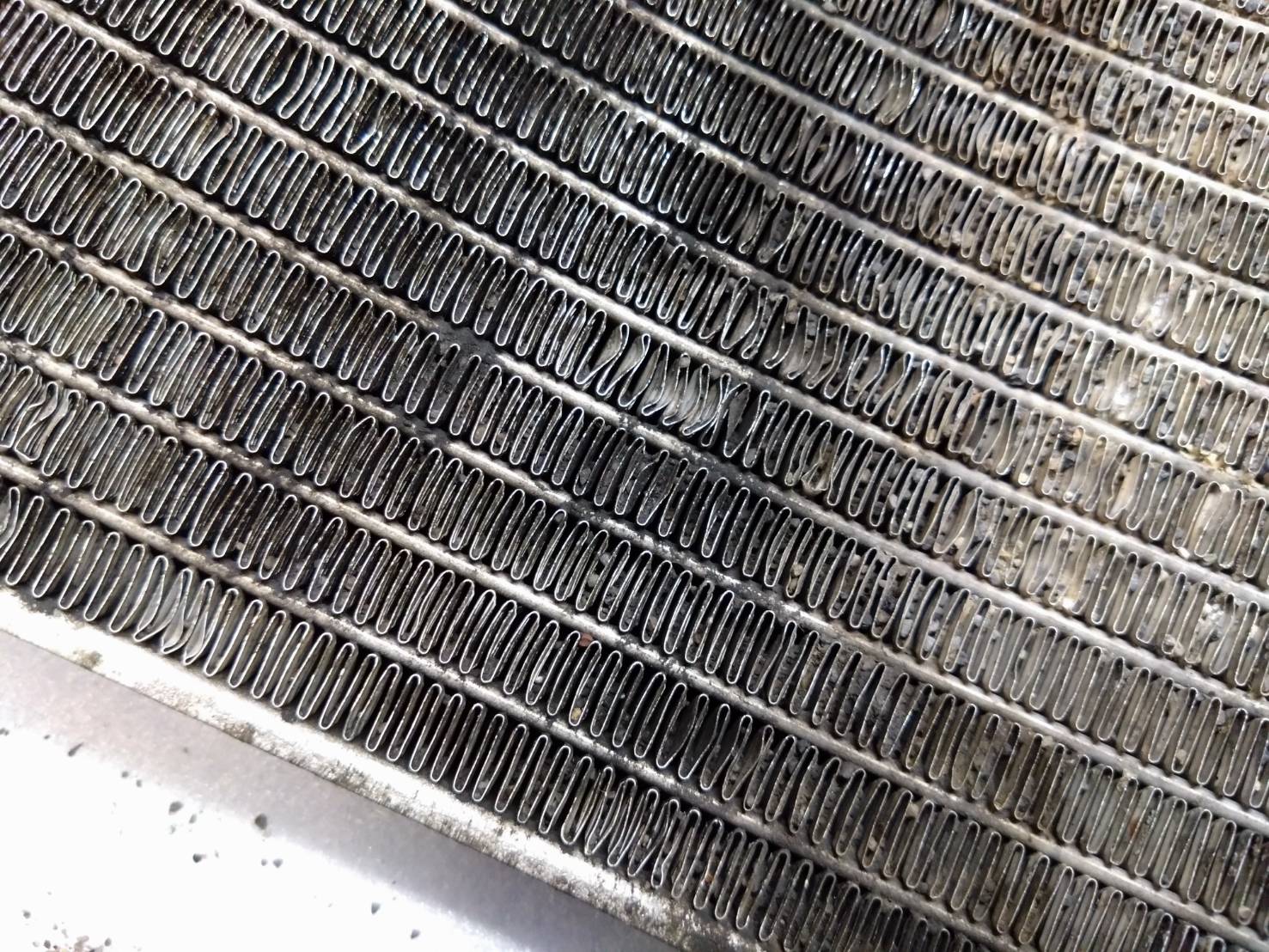 今回の依頼品は、前面からの飛び石によってコアが傷み、フィンの隙間には細かな砂利がびっしりと噛み込んでいた。汚れや変形は外観を損なうだけでなく、冷却性能の著しい低下を招く要因となる。高圧洗浄機など強い圧力をかける方法では、柔らかなアルミ製フィンを容易に潰してしまい、性能を失わせるばかりか修復不能なダメージにつながる危険がある。そのため、過度な圧力による洗浄は避け、フィンの隙間に入り込んだ砂利は手作業で一ヵ所ずつ丁寧に除去を行う。