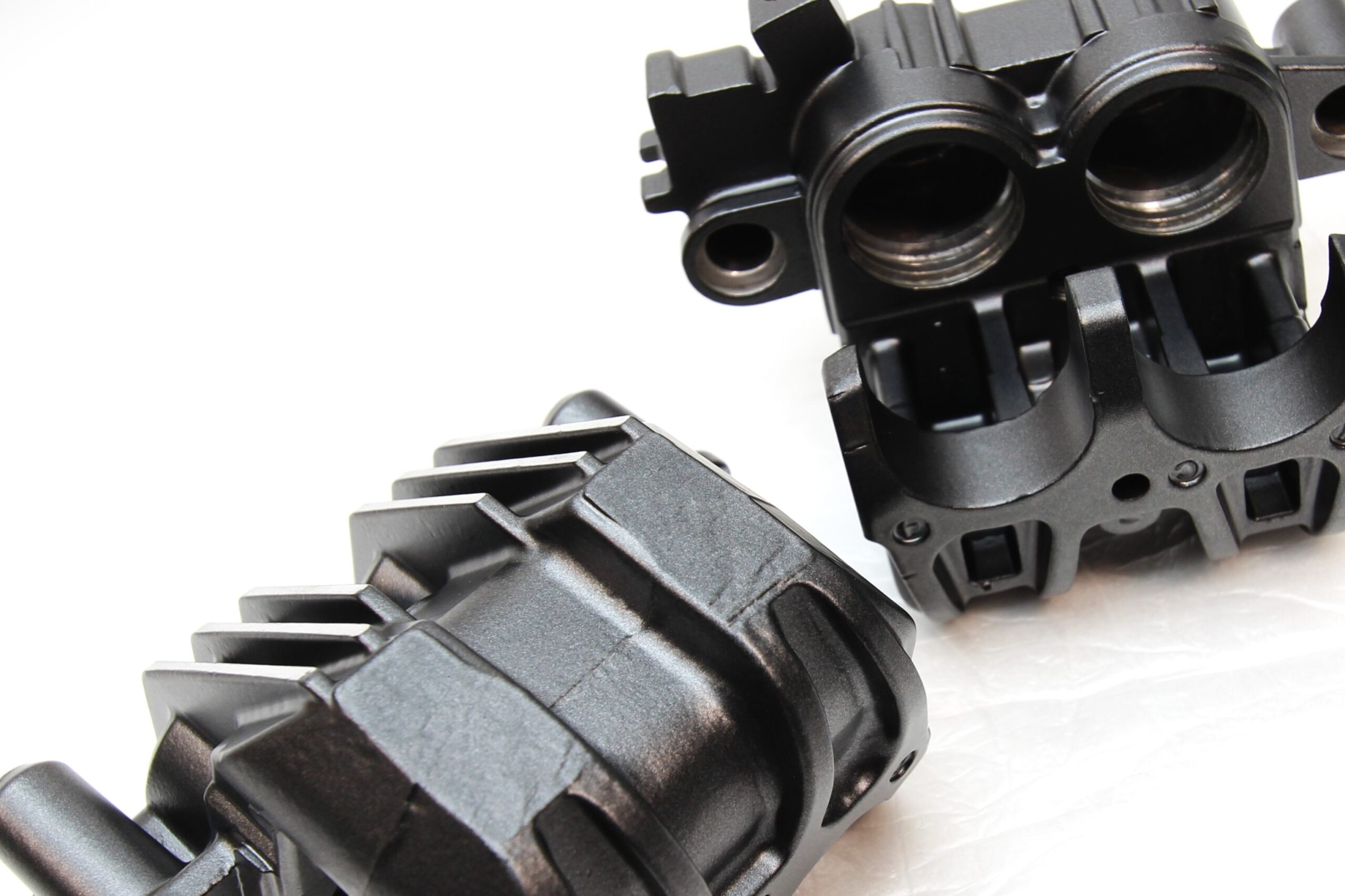 鋳造アルミ特有の質感やフィン形状を崩さないよう下地を整えたうえで、耐熱性および耐薬品性に優れた粉体塗装を施す。ピストンボア、シール溝、取り付け面といった機能部については厳密にマスキングを行う。その精度は制動性能および作動信頼性に直結するため、部品構造を十分に理解したうえでの施工が求められる。